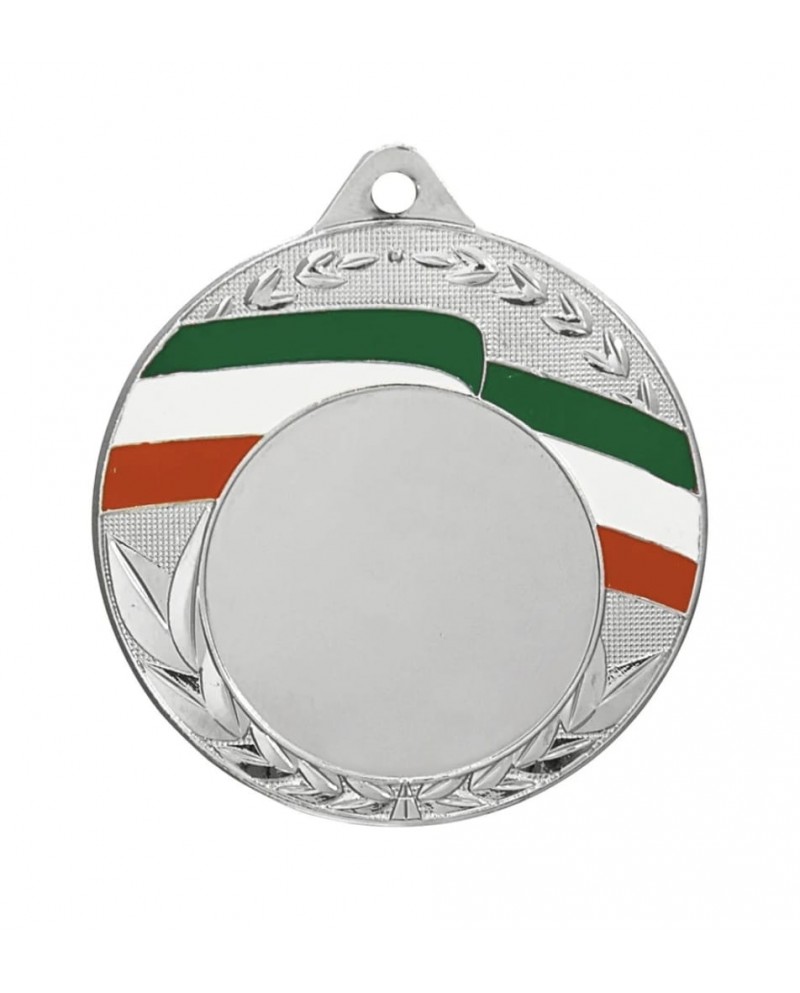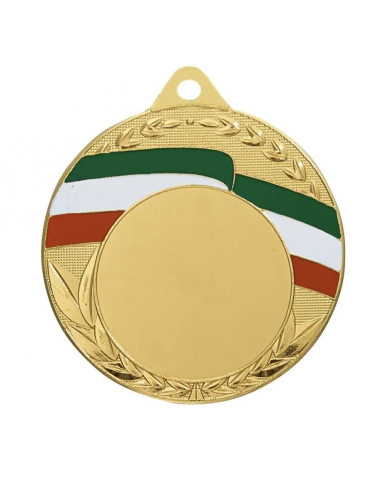 Medaglia sportiva di diametro mm.50 fornita completa di nastro tricolore con gancetto cucito a "V" di larghezza cm.1, compresa di personalizzazione con spazio utile di diametro mm.25
